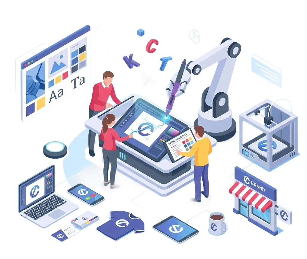企業の顔となるロゴマーク、コーポレートカラー、指定書体などを開発し、視覚的な統一感を作ります。