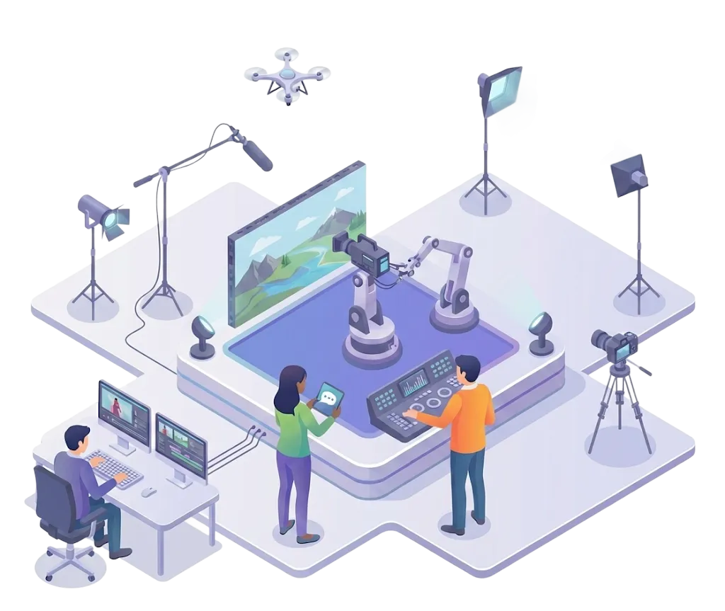 会社紹介ムービー、製品デモ動画、ドローン撮影、スチール撮影など、高品質なビジュアル素材を制作します。